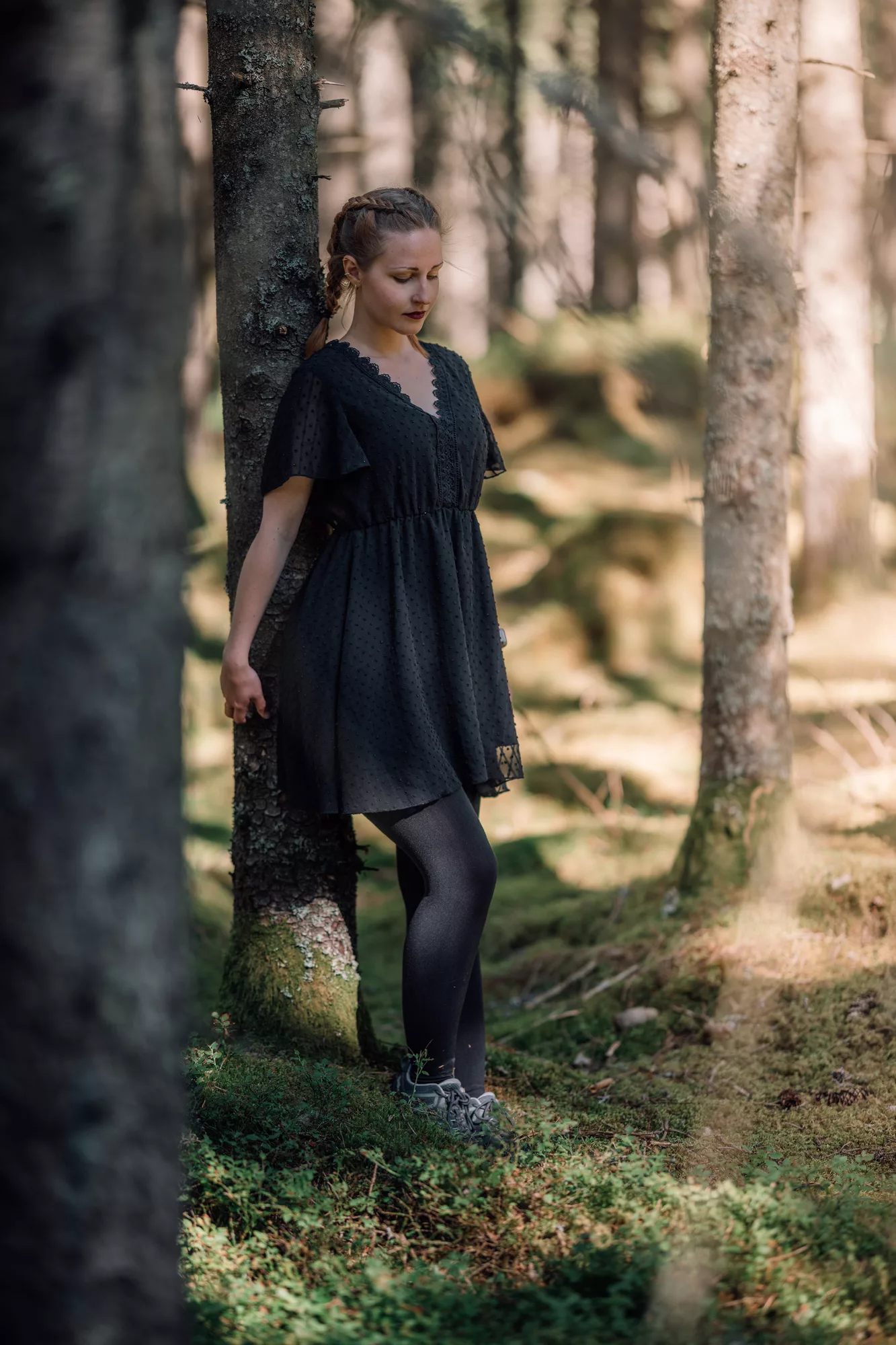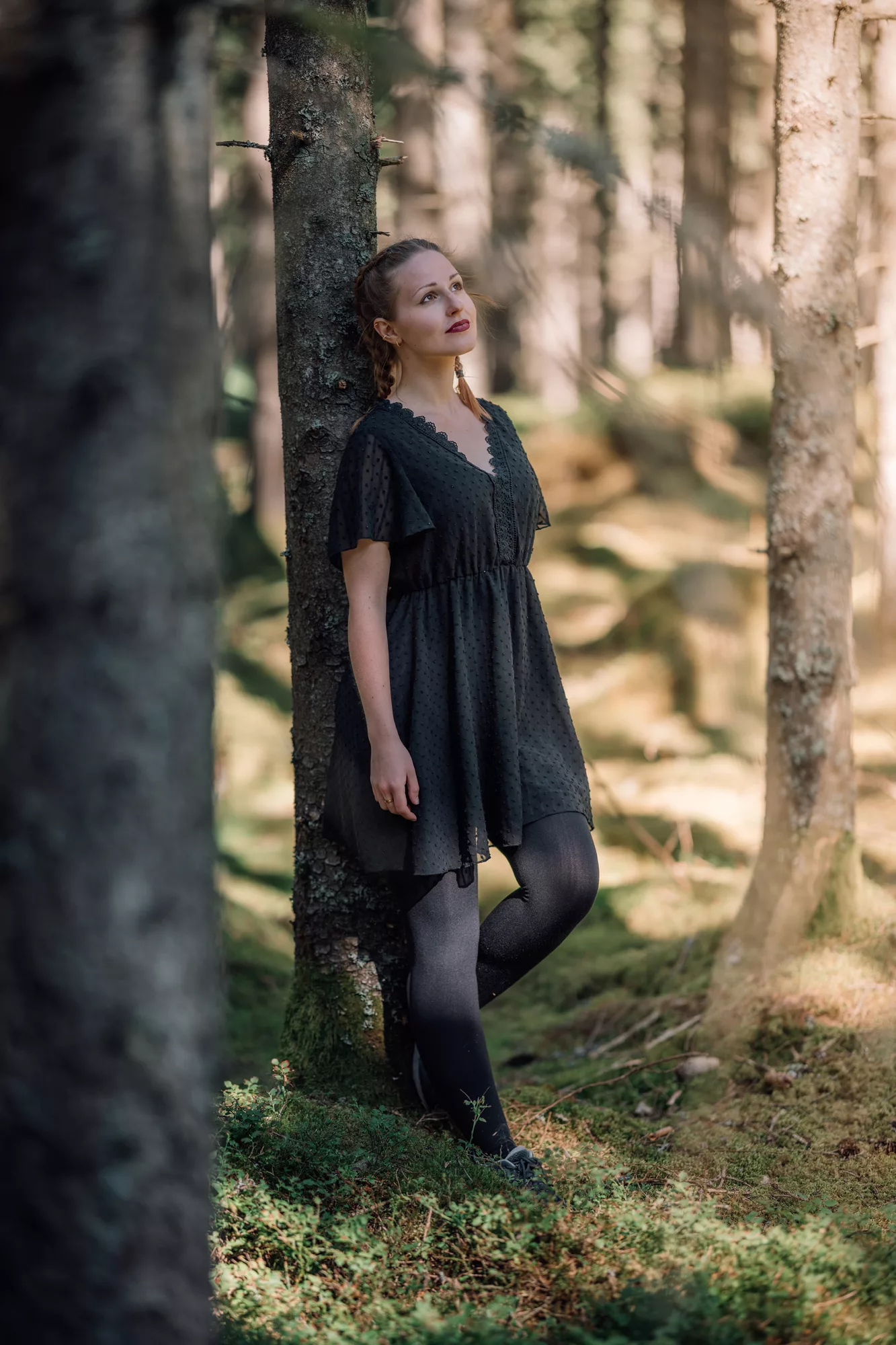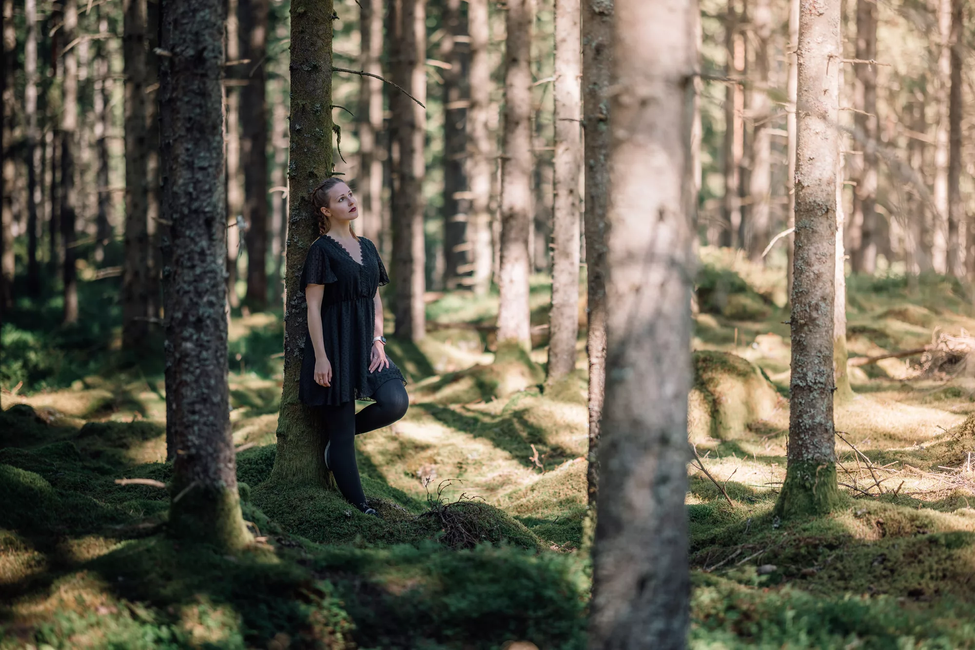 Die dichten Wälder rund um Fristad boten uns eine traumhafte Kulisse für ein Portrait-Shooting. Auch wenn die Mittagssonne für hartes Licht sorgte, fanden wir im Schatten der Bäume schattige, stimmungsvolle Plätze. Die Mischung aus natürlichem Grün, weichem Licht und Paulines Ausstrahlung machte die Fotos besonders intensiv. Nebenbei nutzten wir die Gelegenheit, ein neues Amely Thyst – Smells Like Home für ihr künstlerisches Ich „Amely Thyst“ zu drehen. Der Wald verlieh den Aufnahmen eine angenehme Atmosphäre, die perfekt zur künstlerischen Stimmung passte.