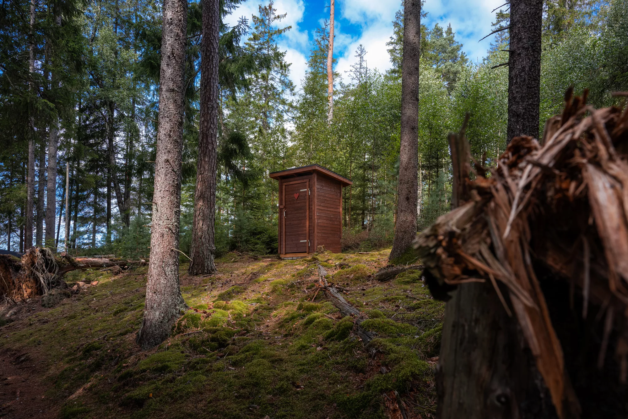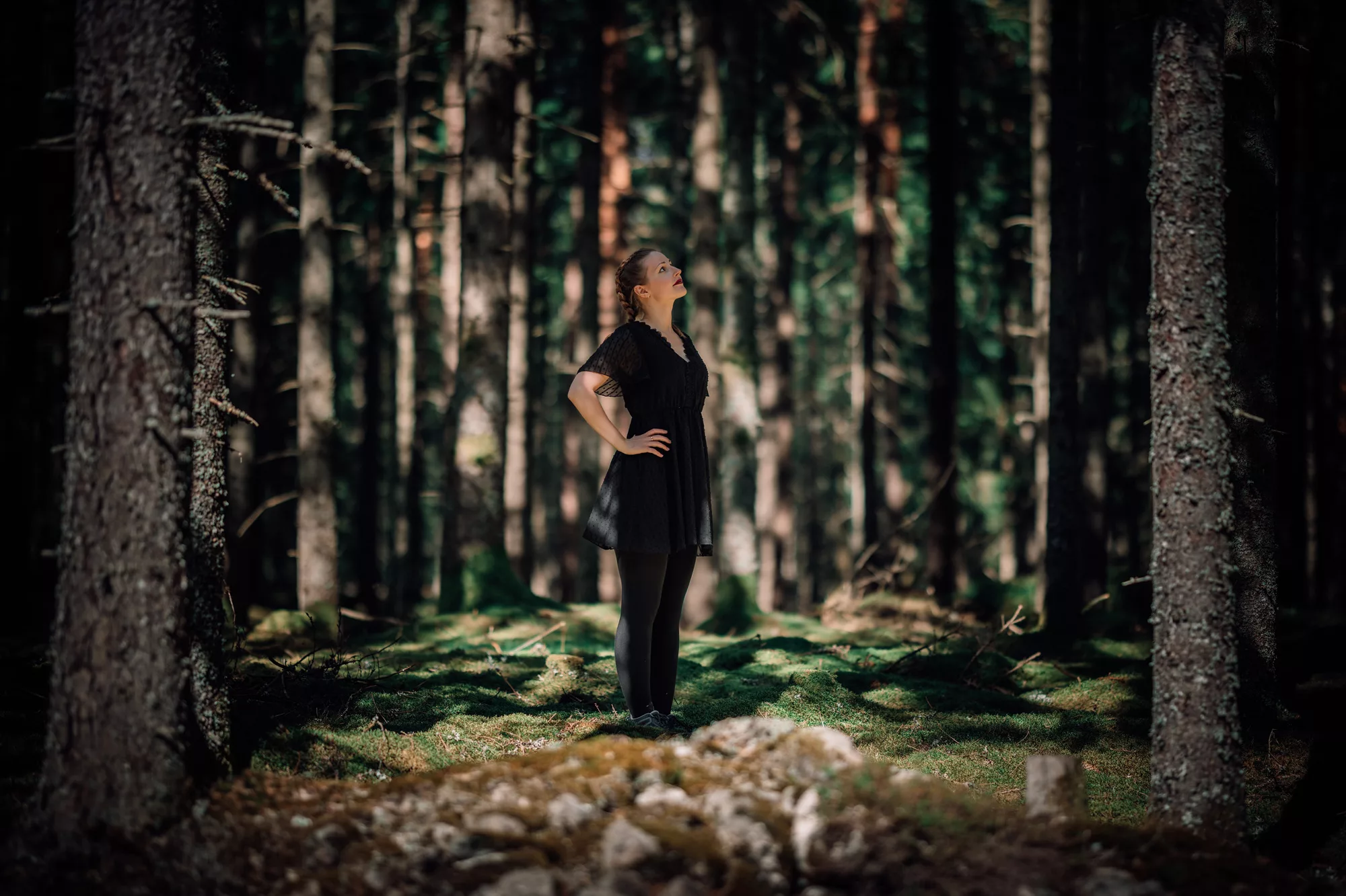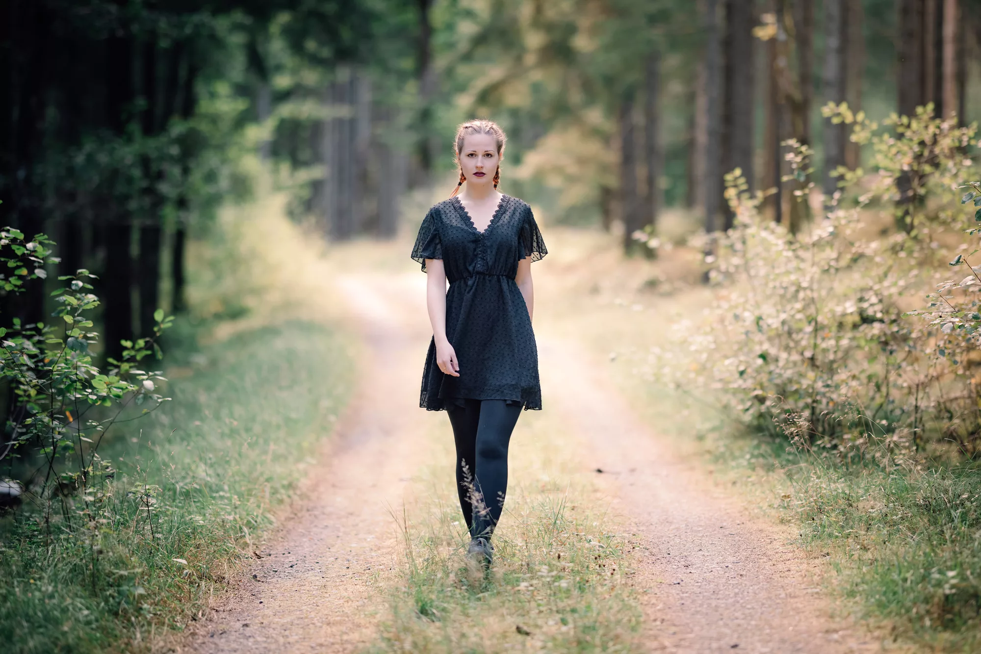 Die dichten Wälder rund um Fristad boten uns eine traumhafte Kulisse für ein Portrait-Shooting. Auch wenn die Mittagssonne für hartes Licht sorgte, fanden wir im Schatten der Bäume schattige, stimmungsvolle Plätze. Die Mischung aus natürlichem Grün, weichem Licht und Paulines Ausstrahlung machte die Fotos besonders intensiv. Nebenbei nutzten wir die Gelegenheit, ein neues Amely Thyst – Smells Like Home für ihr künstlerisches Ich „Amely Thyst“ zu drehen. Der Wald verlieh den Aufnahmen eine angenehme Atmosphäre, die perfekt zur künstlerischen Stimmung passte.